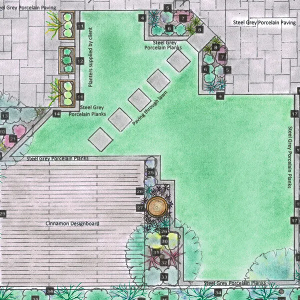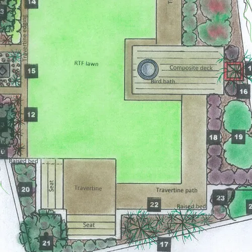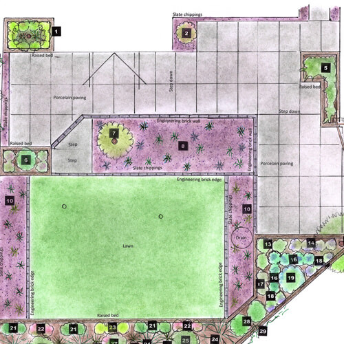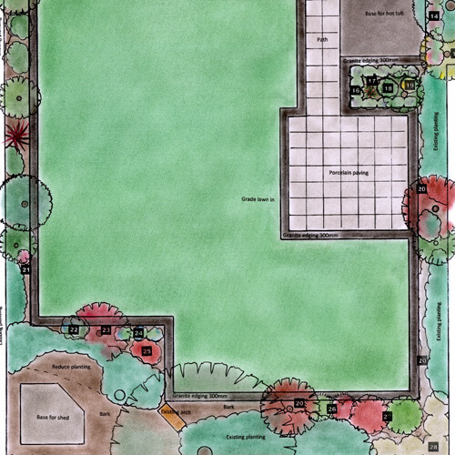 This page is a snapshot of the bespoke hand drawn plans that I produce. Each client will have approved the final plan. Pencil drafts are emailed prior to finalising in ink, colour & planting scheme.I work out hard landscaping to minimise waste, which saves on labour costs, therefore the budget will go further.